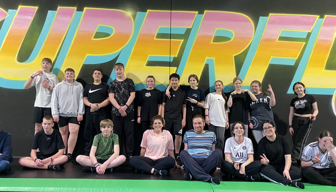 Am Freitag, den 21.04.2023 besuchte die Klasse 8b die Trampolinhalle in Kassel. Trotz Bahnstreiks erreichten wir pünktlich um 9:30 Uhr das Superfly und durften nach einem kurzen Einweisungsvideo direkt auf die 3.500 m2 große Fläche, auf der uns unterschiedlichste Trampoline, Parcours und Klettermöglichkeiten erwarteten. Rund 90 Minuten konnten sich die Schülerinnen und Schüler aber auch die Lehrpersonen so richtig austoben. Zwischendurch konnten sich die Schülerinnen und Schüler mit Essen und Getränken stärken. Nach einem gelungenen und sportlichen Tag ging es gegen 13 Uhr wieder mit der Bahn Richtung Hann. Münden.