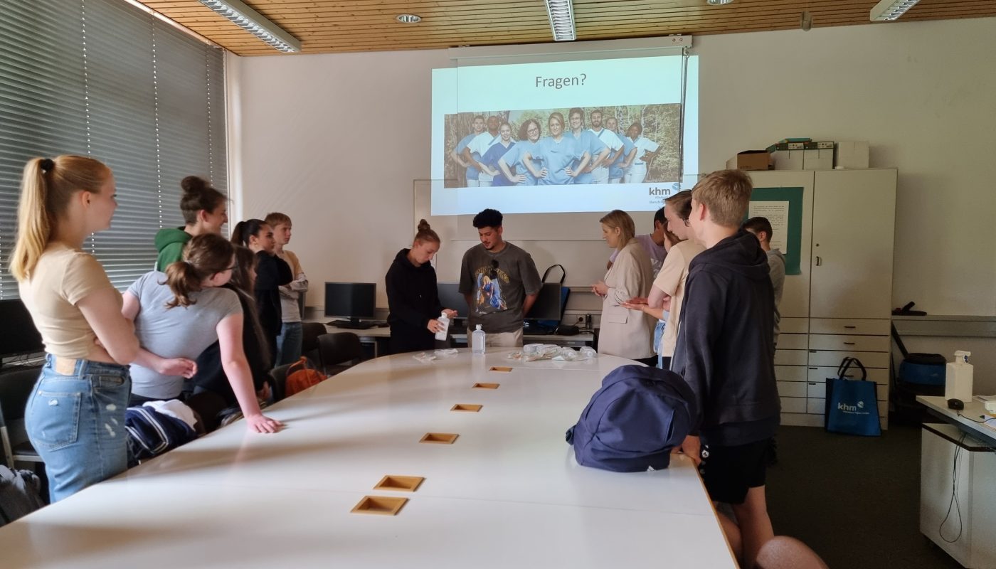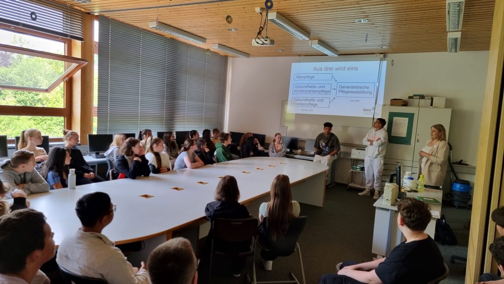 Am 31.05. (10. Jahrgang) und 06.06.2023 (9. Jahrgang) stellte sich die Berufsfachschule Pflege aus Hann. Münden an der Werra-Realschule vor. Mit dabei waren Lehrerinnen, aber auch Auszubildende der Pflegefachschule. So konnten die SchülerInnen des neunten und zehnten Jahrgangs in einer lebhaften Fragerunde einige Details aus dem Berufsleben der Auszubildenden erfahren.