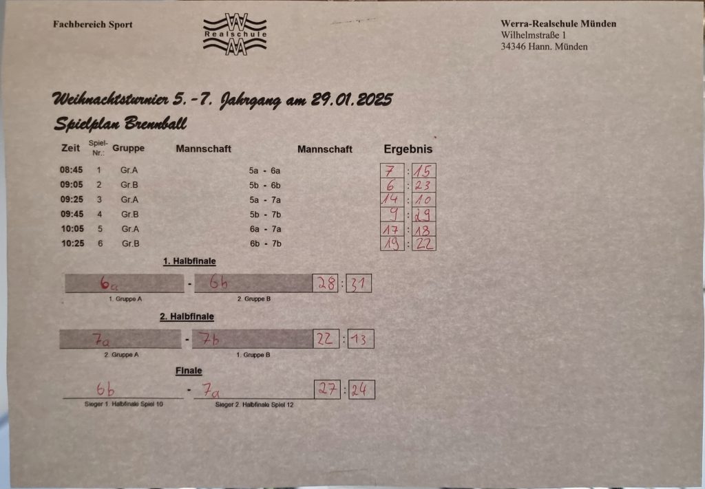 Am 29.01. fand das alljährliche Sportfest der Werra-Realschule statt. Schüler der Jahrgänge 5 bis 7 traten in einem Brennball-Wettbewerb gegeneinander an. Die Spiele verliefen durchweg spannend und fair. Viele Partien waren hart umkämpft, und die Teams zeigten großen Einsatz sowie Teamgeist. Besonders die Klasse 6b überzeugte mit ihrem Können und sicherte sich nach mehreren knappen Begegnungen den Gesamtsieg. Am Ende feierten alle gemeinsam ein gelungenes Sportfest, das nicht nur sportliche Leistungen bot, sondern auch den Zusammenhalt der Schulgemeinschaft stärkte.